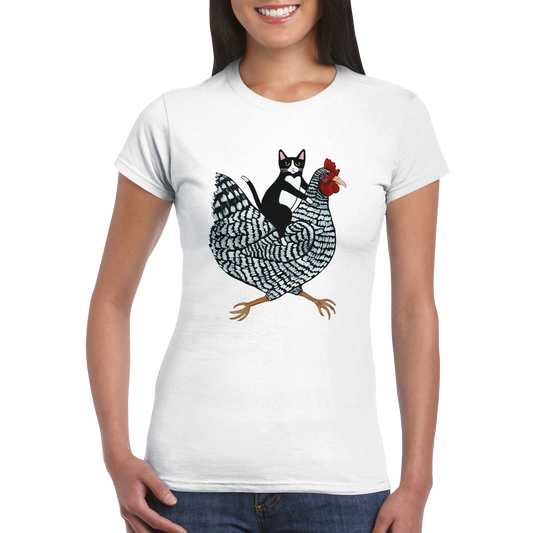 Katze reitet Huhn Damen T-Shirt – Ein humorvolles T-Shirt für Tierfreunde